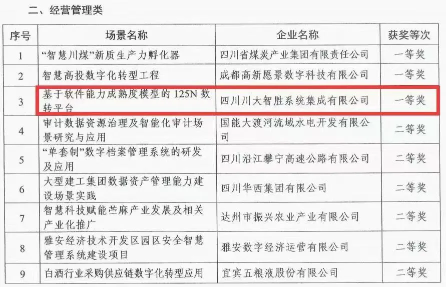 此外,川投數(shù)科(原簡稱:智勝集成)服務“智改數(shù)轉(zhuǎn)”的熱度正不斷升溫。日前,川投數(shù)科(原簡稱:智勝集成)基于軟件能力成熟度模型集成(CMMI)打造的125N(1平臺、2中心、5應用、N場景)數(shù)轉(zhuǎn)平臺獲四川省國資國企數(shù)字化轉(zhuǎn)型優(yōu)秀場景評選一等獎。