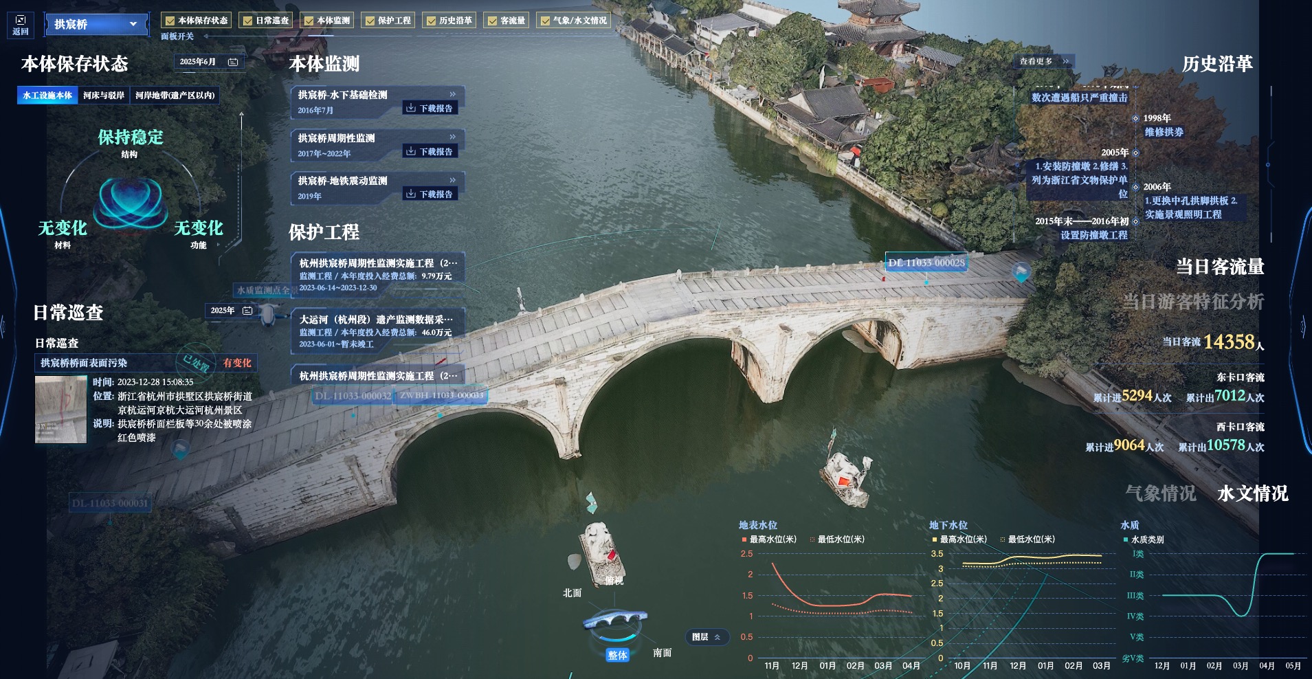 ? 杭州段作為中國大運河沿線唯一兼具三河(隋唐大運河、京杭大運河和浙東運河)歷史遺存的重要河段,遺產要素豐富?!皵?shù)智運河”系統(tǒng)通過多維度數(shù)據(jù)采集、多跨協(xié)同聯(lián)動、多元監(jiān)測等創(chuàng)新手段,實現(xiàn)對大運河遺產格局的全方位管理。該系統(tǒng)提升了大運河(杭州段)保護管理的效率與精度,展現(xiàn)了杭州在文化遺產保護領域的創(chuàng)新實踐,為同類型大型、線性、活態(tài)遺產的保護提供了可復制、可推廣的“杭州經驗”,入選2024年首屆浙江省文化遺產保護監(jiān)測十佳案例,并獲評國家文物局公布的2024年度文物事業(yè)高質量發(fā)展推介入圍案例。