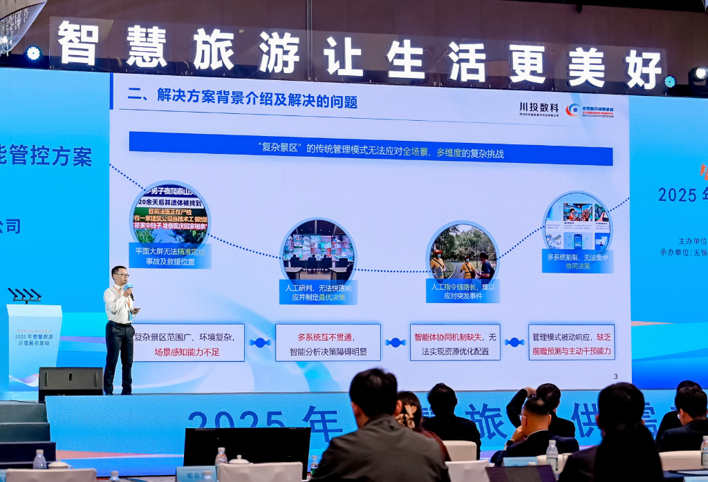 10月28日至29日,由文化和旅游部資源開發(fā)司與江蘇省文化和旅游廳、無錫市人民政府共同主辦的“2025年智慧旅游示范展示活動”在江蘇無錫隆重舉行。作為智慧旅游領(lǐng)域的年度盛會,本次活動以“智慧旅游讓生活更美好”為主題,展示智慧旅游發(fā)展成果,推動示范引領(lǐng)和供需對接,進一步推動《智慧旅游創(chuàng)新發(fā)展行動計劃》落地見效。四川川投智勝數(shù)字科技有限公司(以下簡稱“川投數(shù)科”)憑借“基于文旅大模型智能體與數(shù)字孿生的景區(qū)全場景虛擬映射模型與智能管控方案”,再次驚艷亮相,成為行業(yè)焦點。作為四川能源發(fā)展集團旗下所屬川投信息產(chǎn)業(yè)集團有限公司控股的技術(shù)型領(lǐng)軍企業(yè),川投數(shù)科連續(xù)三年受邀參會,其路演的創(chuàng)新實踐案例獲得了專家團隊高度認可,成為行業(yè)標桿案例。